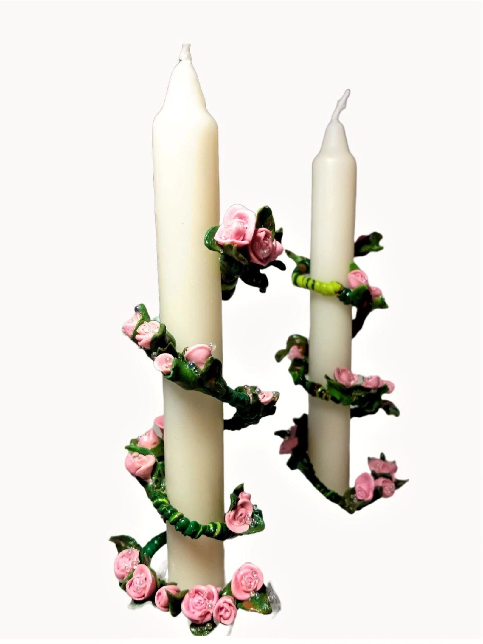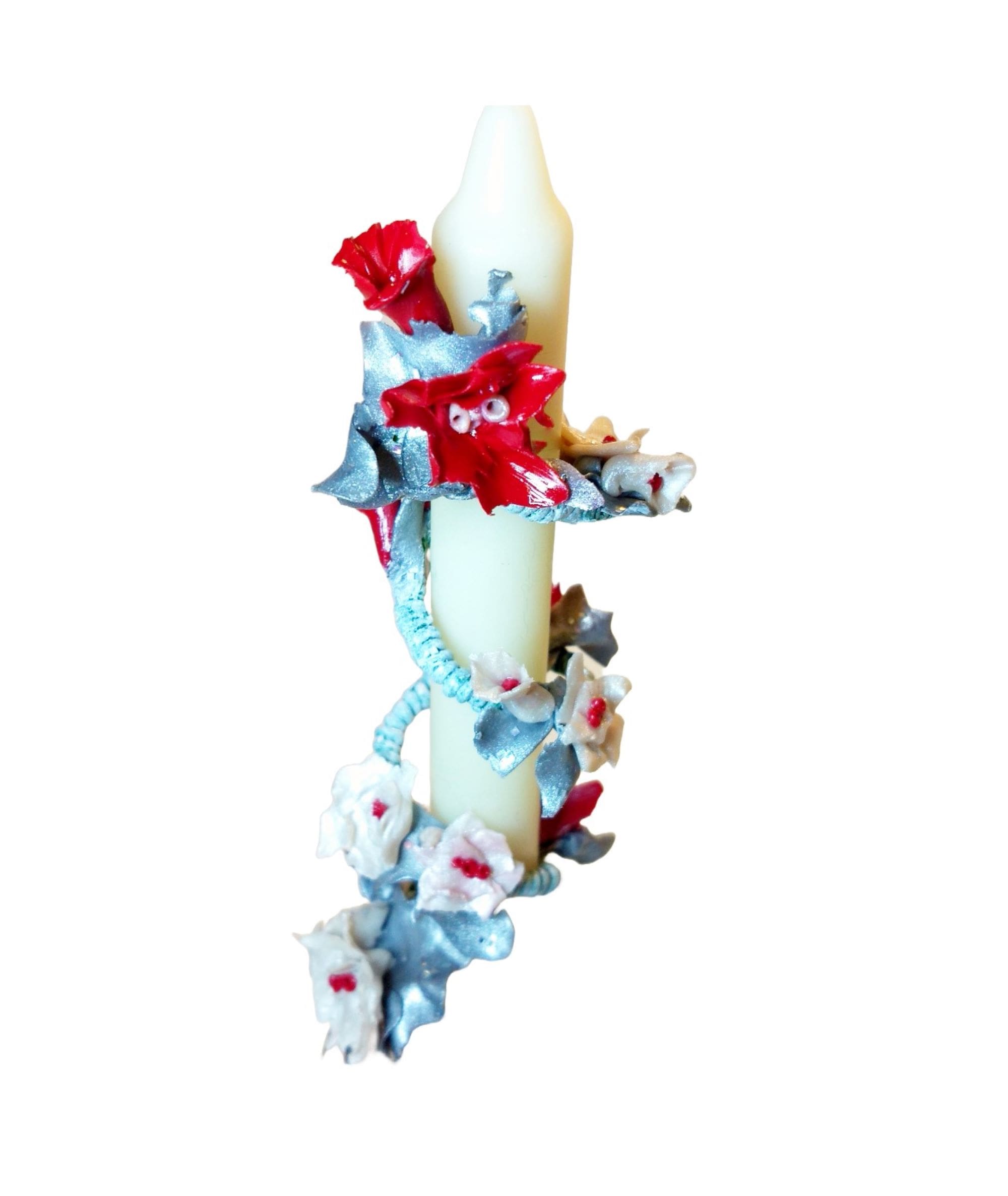 White Dinner 6″ Taper Candle Set with Ceramic Blue or Pink Hydrangea Flowers.