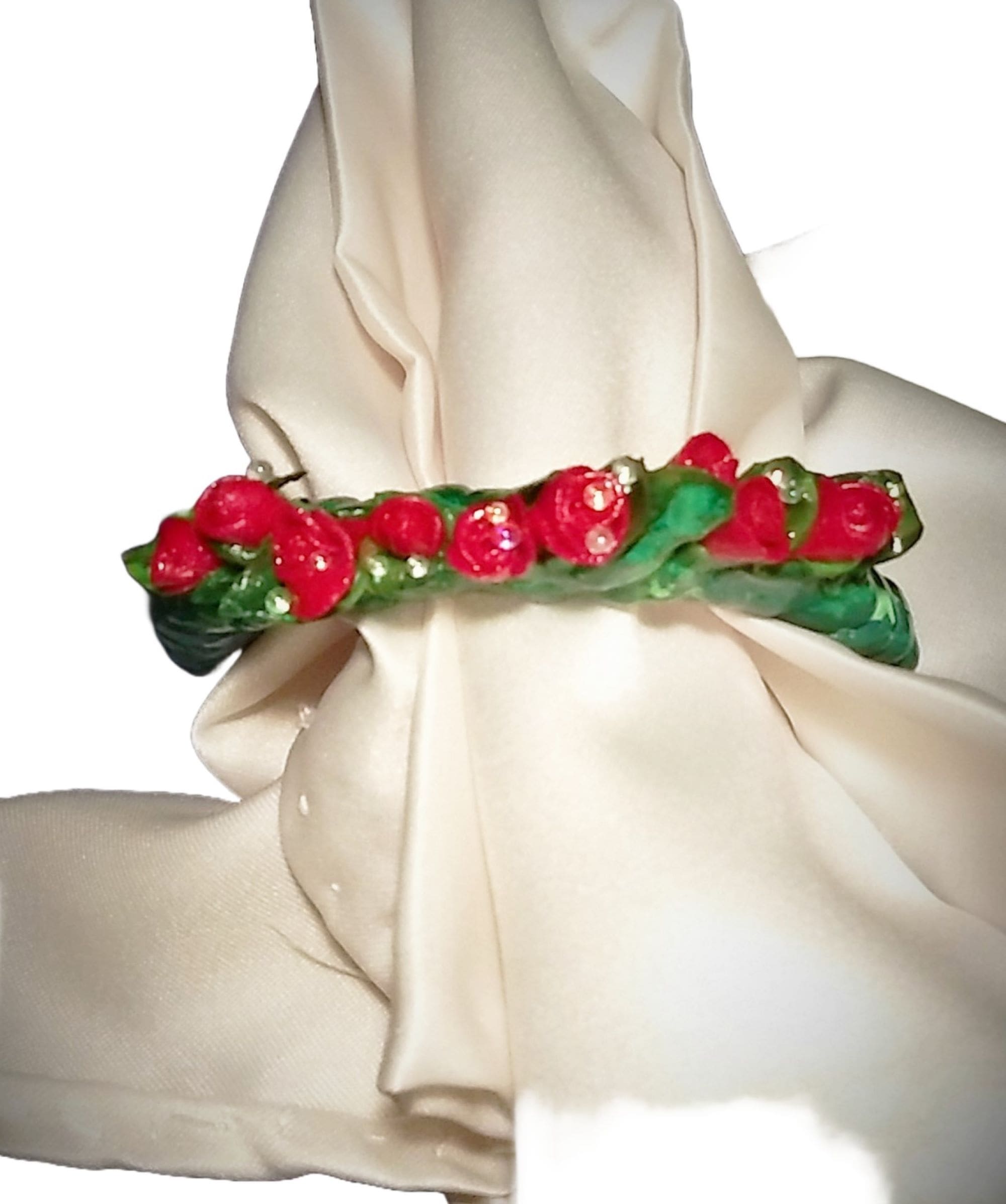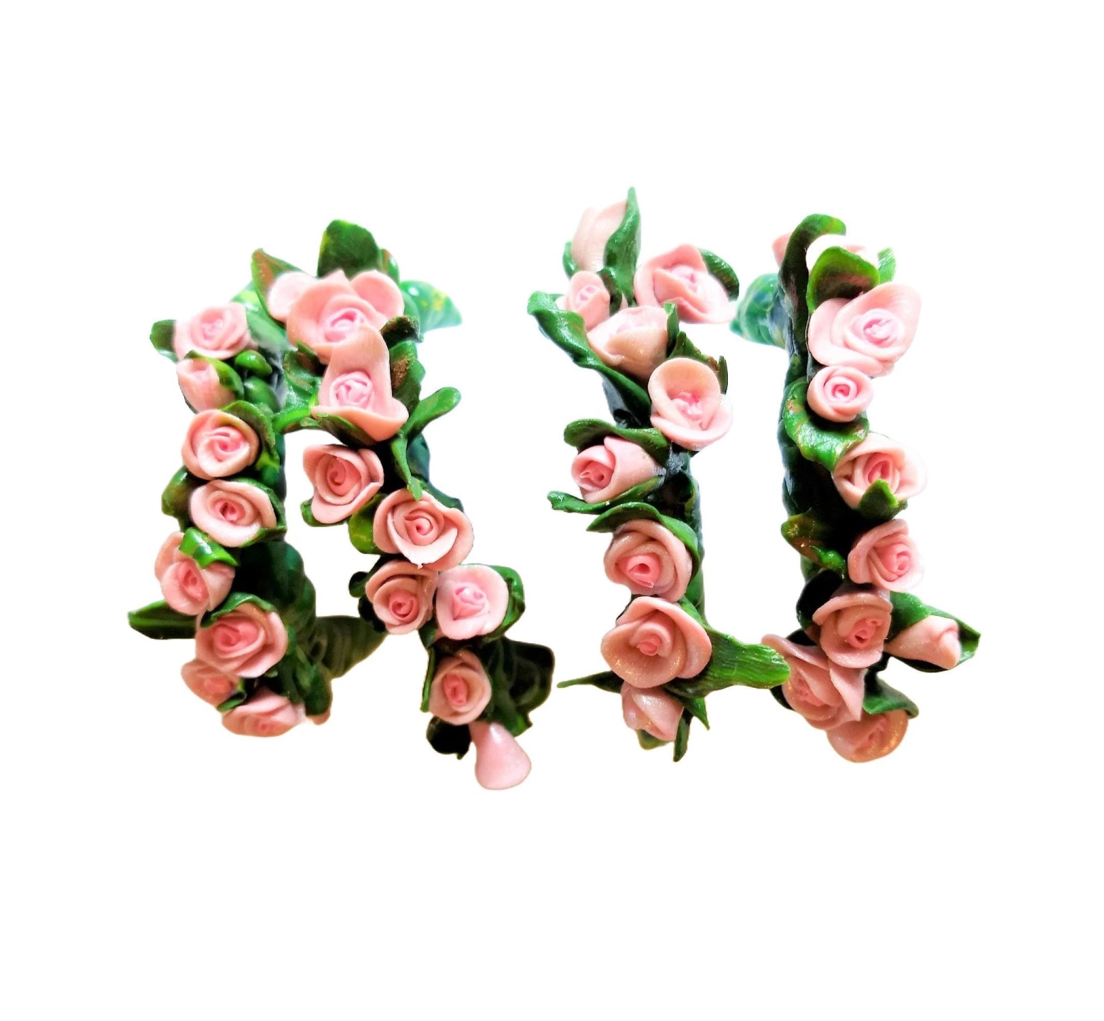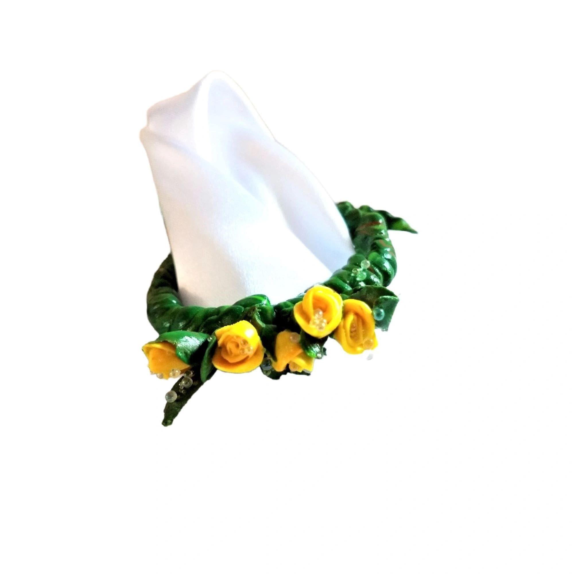These baby roses napkin rings set of 4 do match the candle vines which are sold separately. The rose napkin rings can also be ordered in red, pink or yellow roses. They look elegant and classic but not too formal. Fit well with cotton or paper napkins. Silk napkins not recommended. Made of nontoxic polymer clay, ceramic with non toxic glaze. They rinse clean. Do NOT place in dishwasher. microwave or oven. Gar-Zen Botanical Design Studio in Florida. Custom orders are welcome. Any order over 10 sets, allow 3 weeks. We can do replacements or exchanges just contact us.