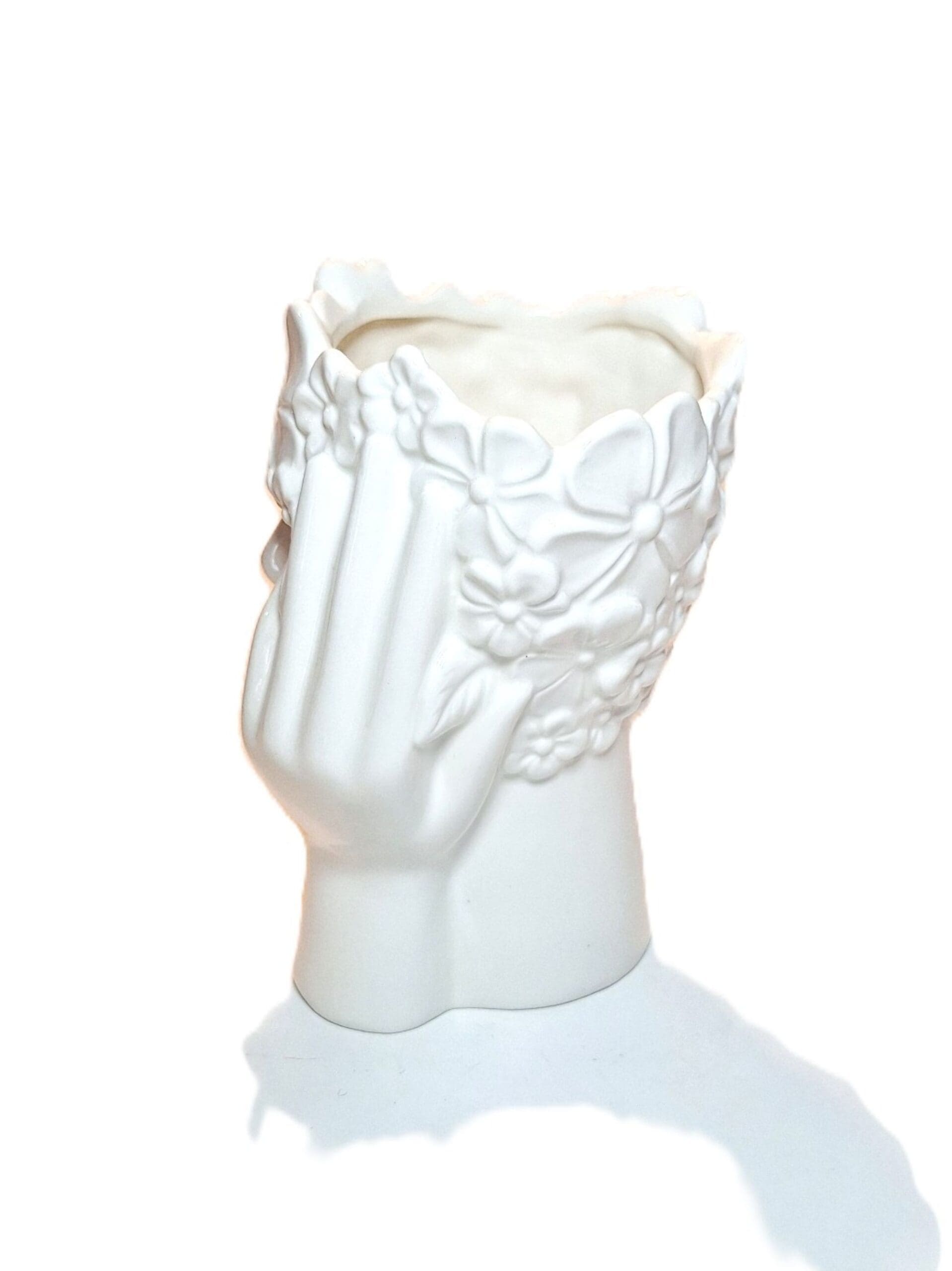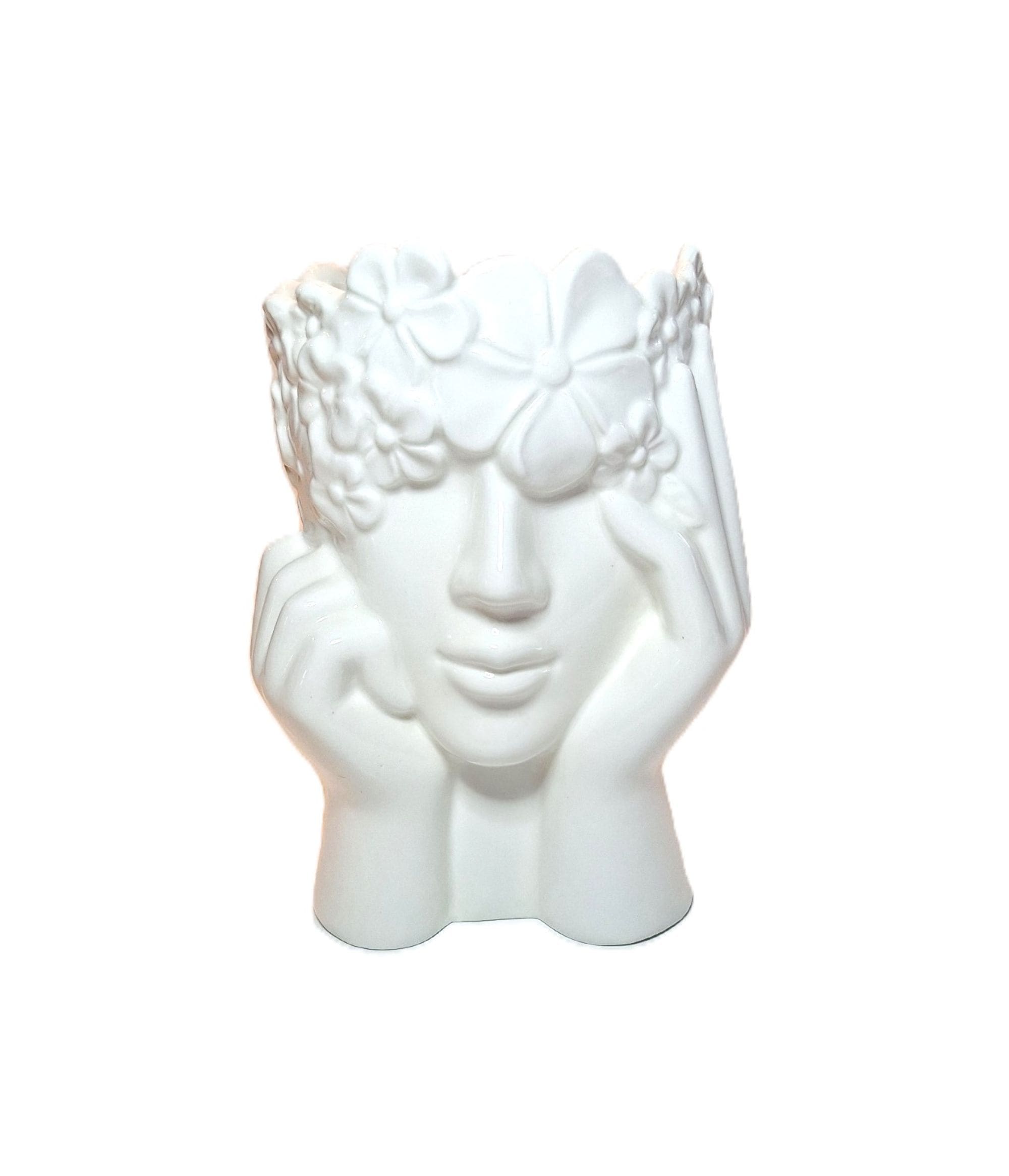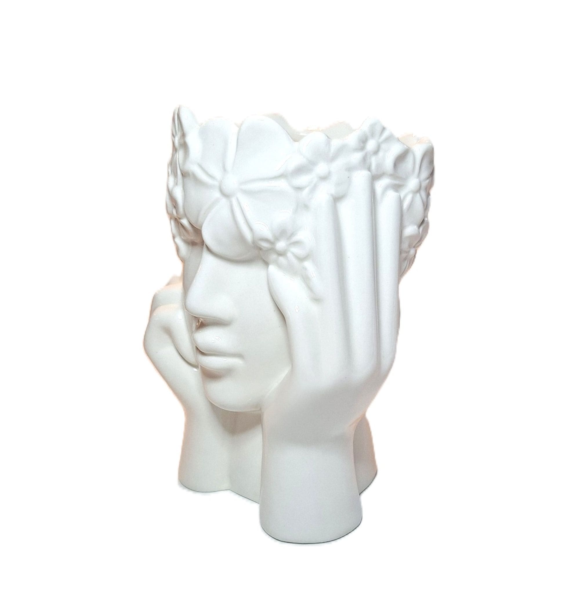 Bring a touch of artistic elegance into your home with this beautifully sculpted white ceramic face vase. This unique design features a serene female face framed by gently resting hands and topped with a detailed floral crown, creating a soft, expressive look that stands out in any décor style.
