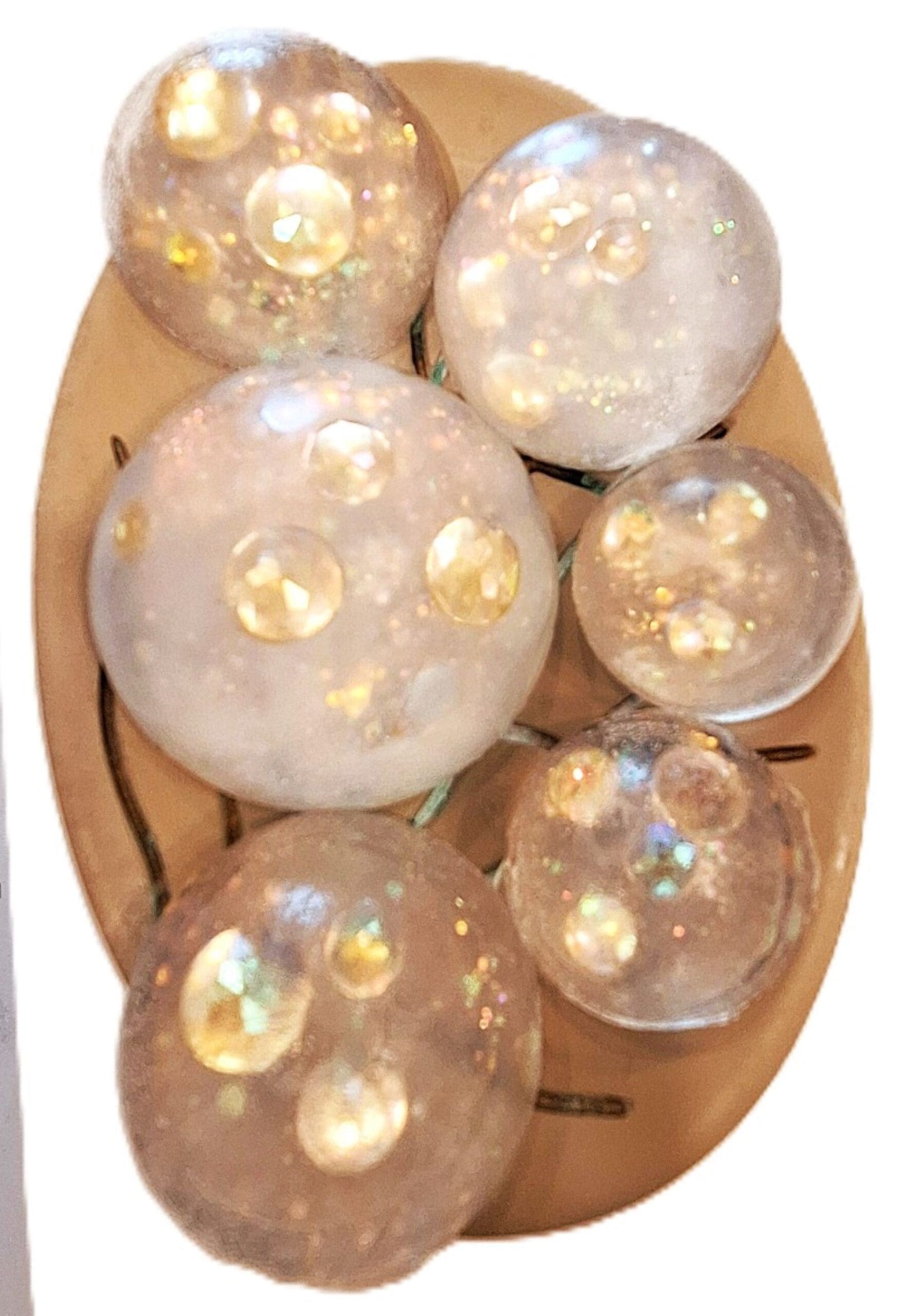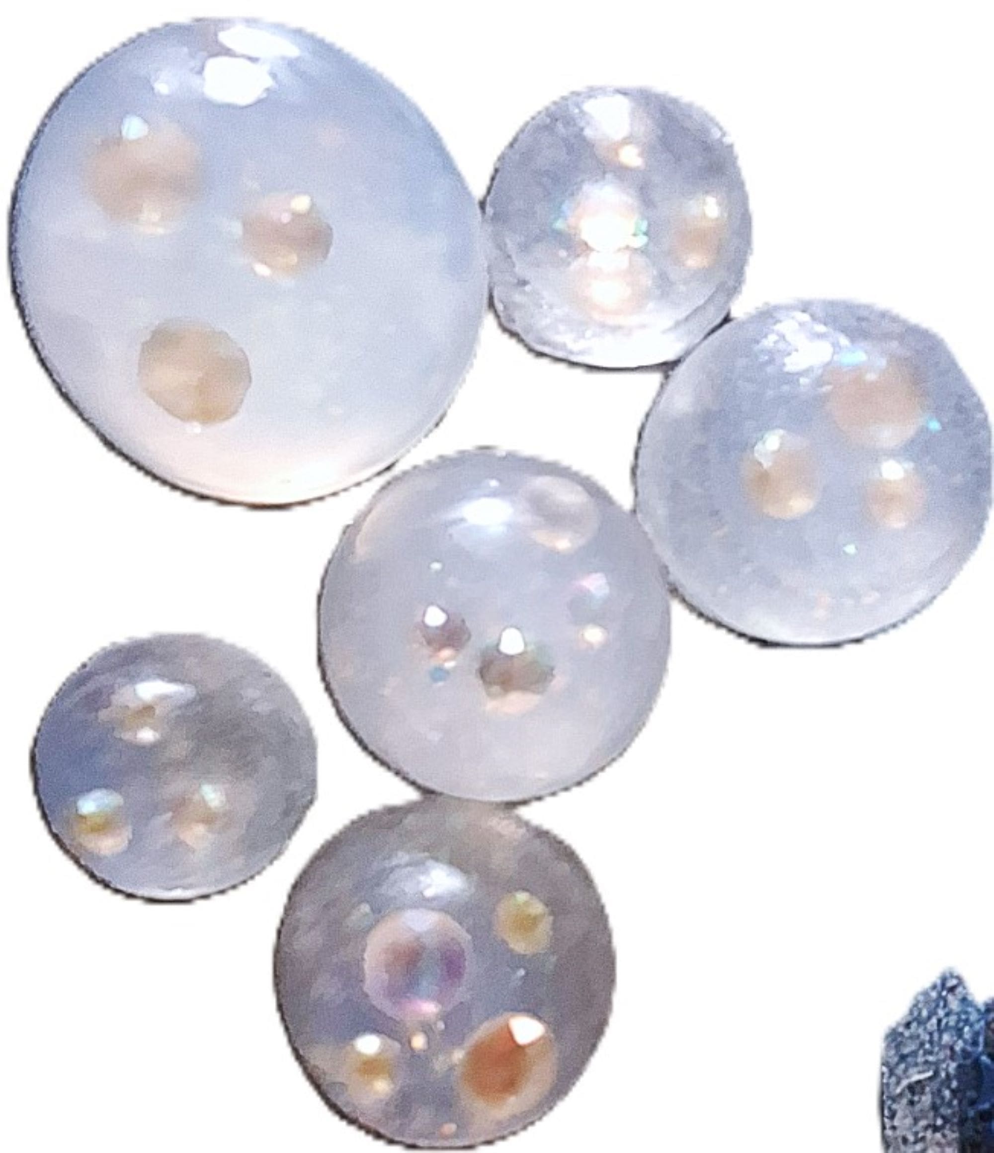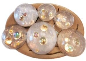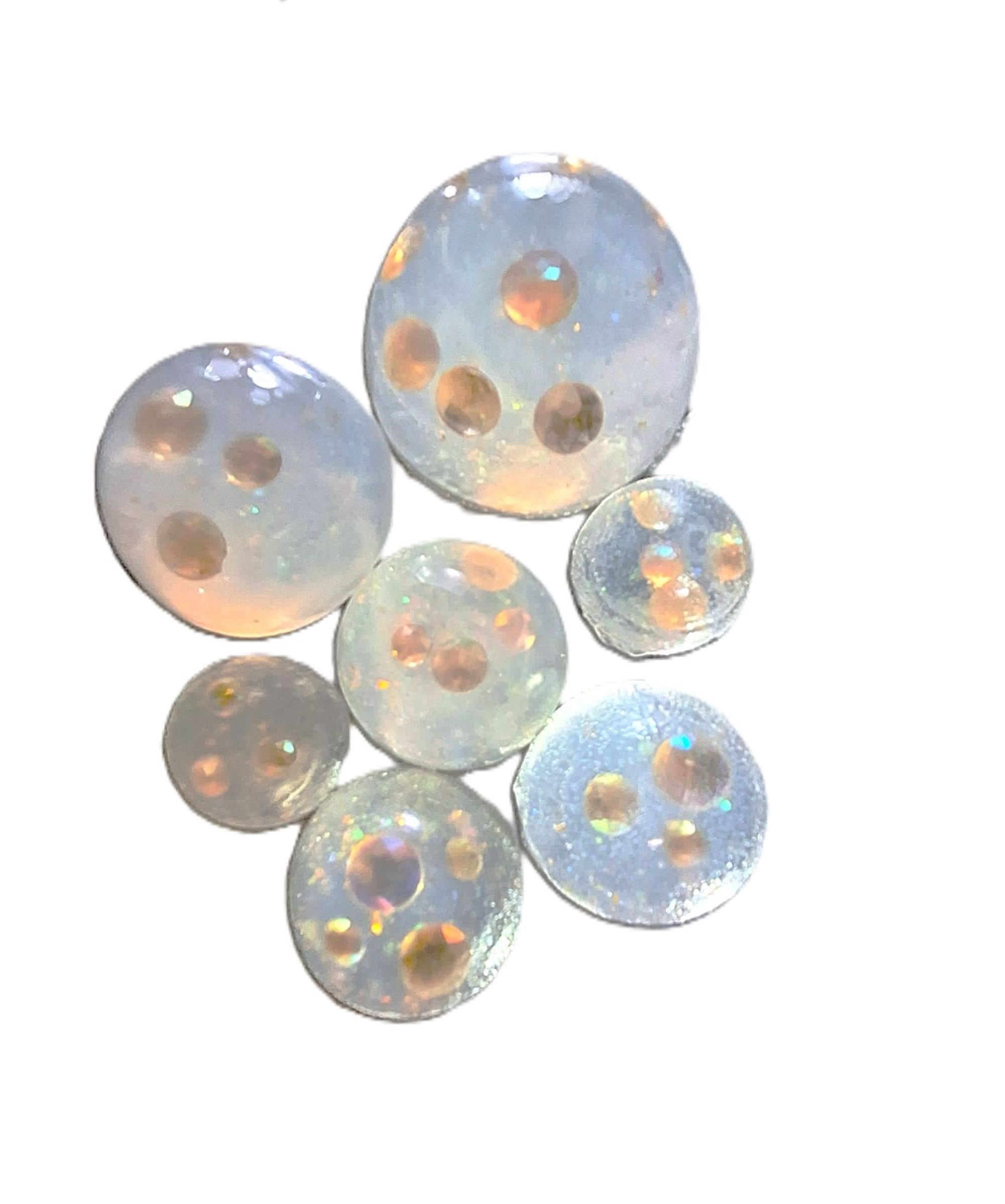 Jeweled Soap Set — a stunning collection of 7 clear glycerin rounds designed to shine. Each soap is handcrafted with embedded rhinestones and shimmering body glitter, creating a luxurious visual effect that feels as good as it looks. All ages can enjoy these from sweet sixteen parties, sleep overs, cheer leaders to teachers and guest. These are unscented, no perfumes.