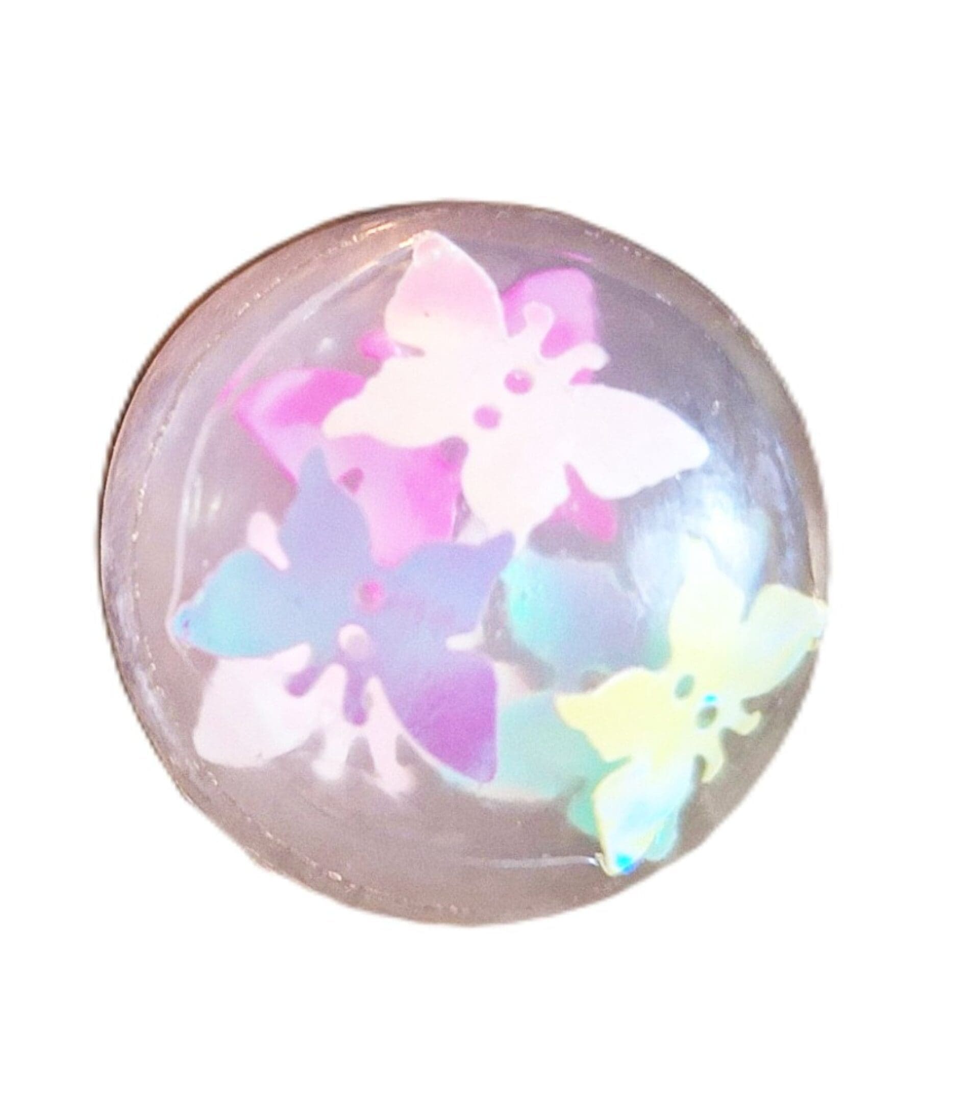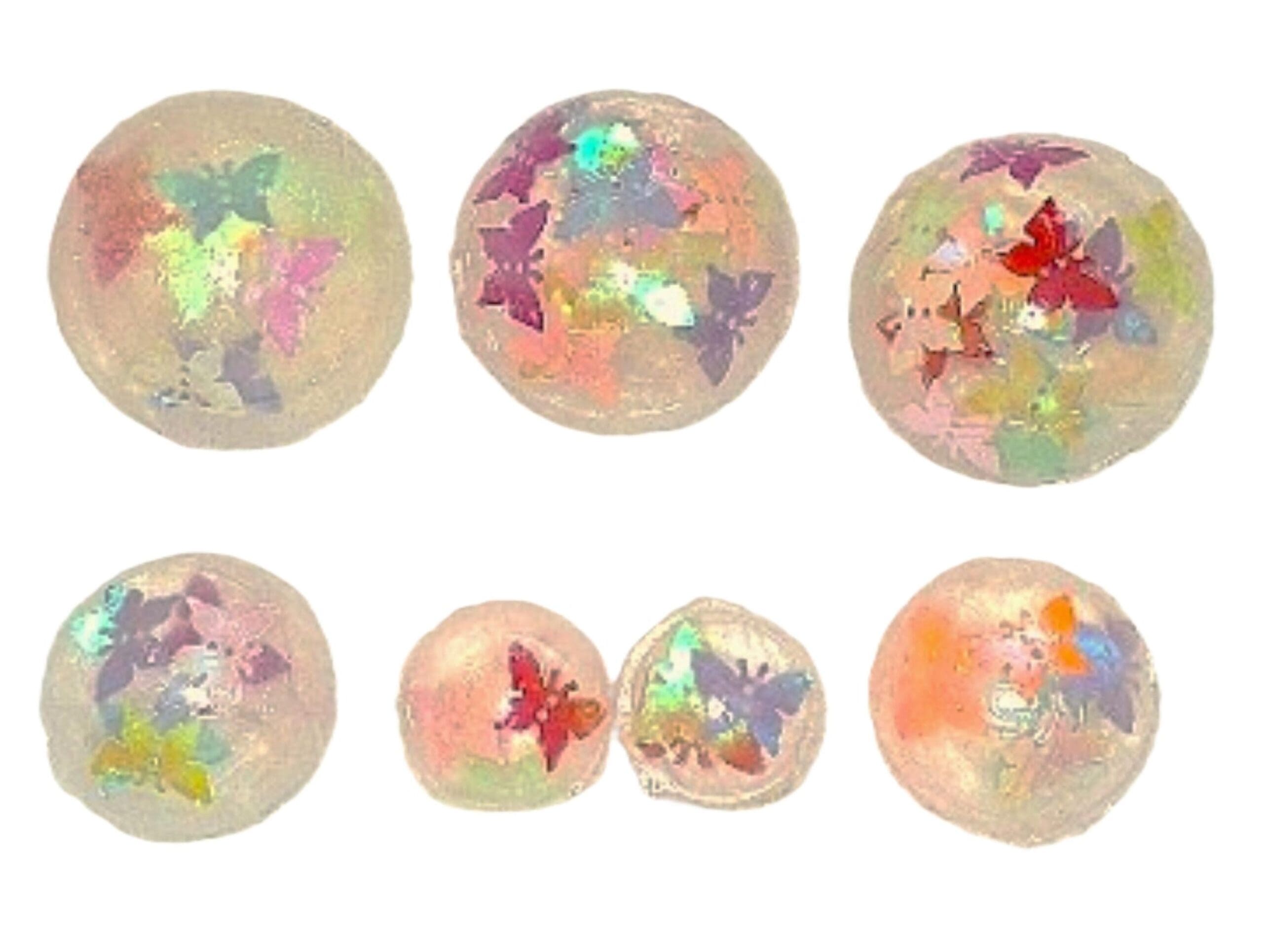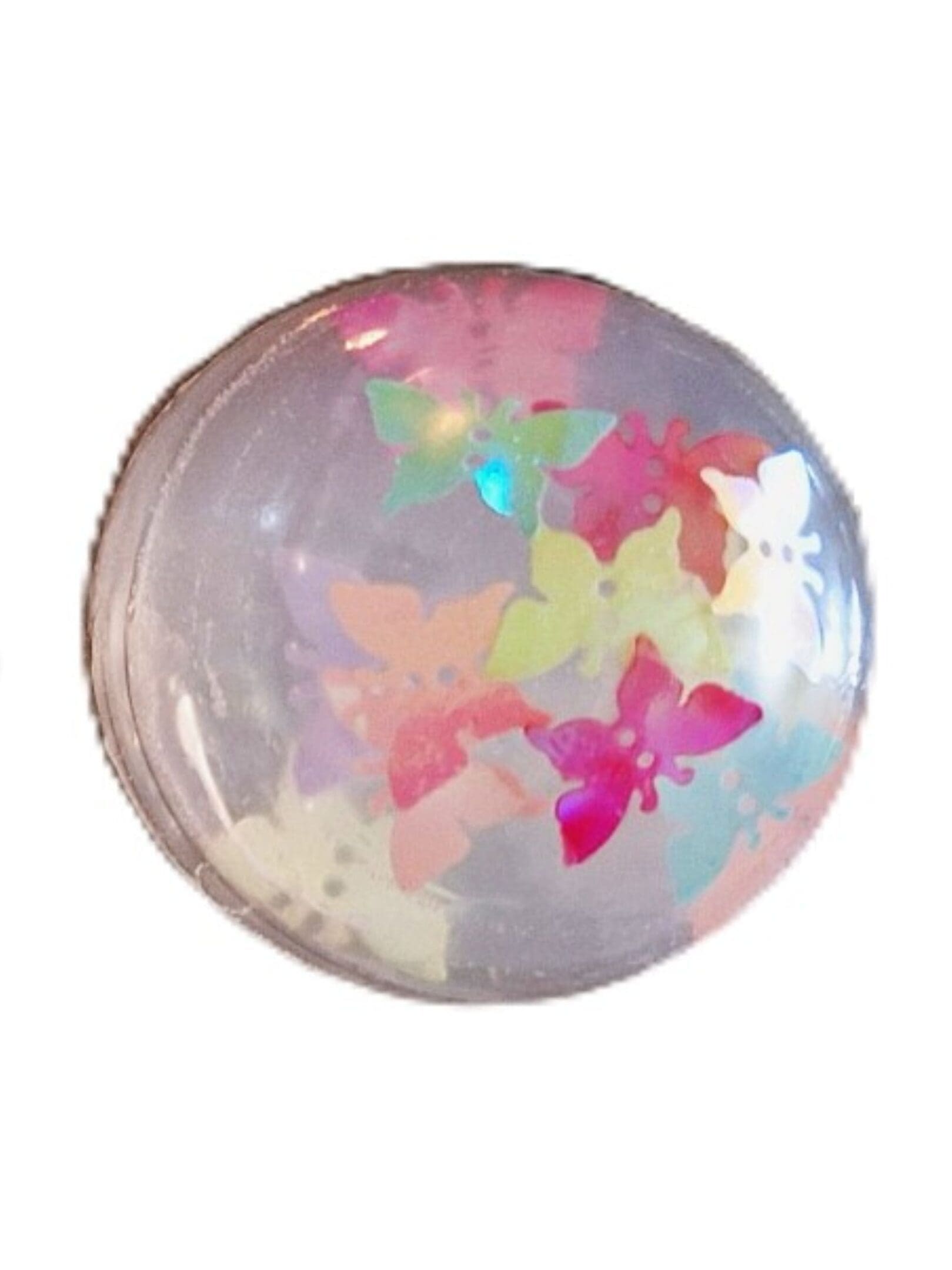 Especially designed for people with sensitive skin and allergies. A white ball with many colorful butterflies on it.