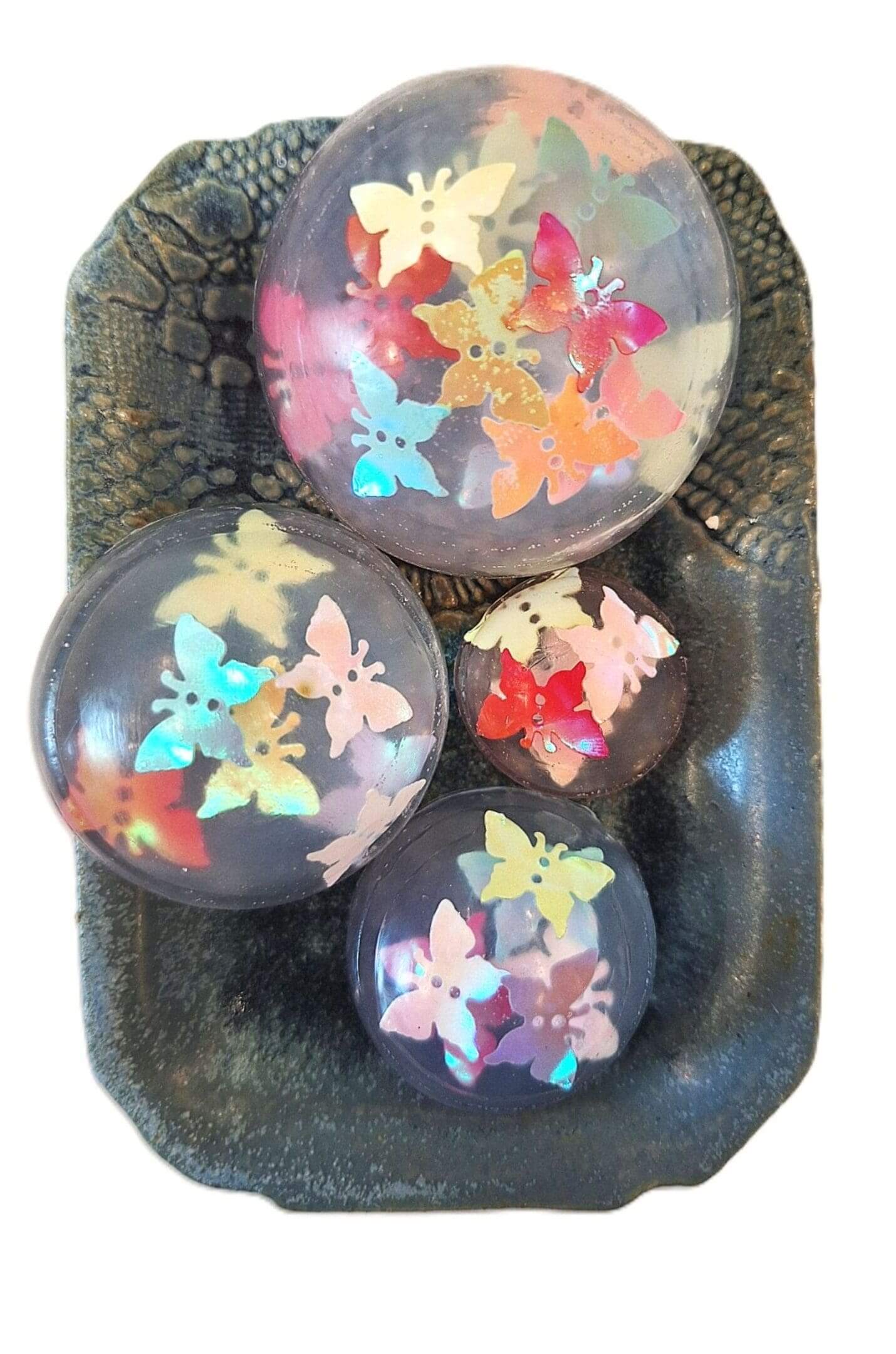 This enchanting 7‑piece butterfly soap set is handmade with crystal‑clear vegetable glycerin and filled with shimmering iridescent butterfly accents that appear to float inside each round. A great birthday, get-well, or co-worker gift. Set of 7 soaps in a variety of sizes.