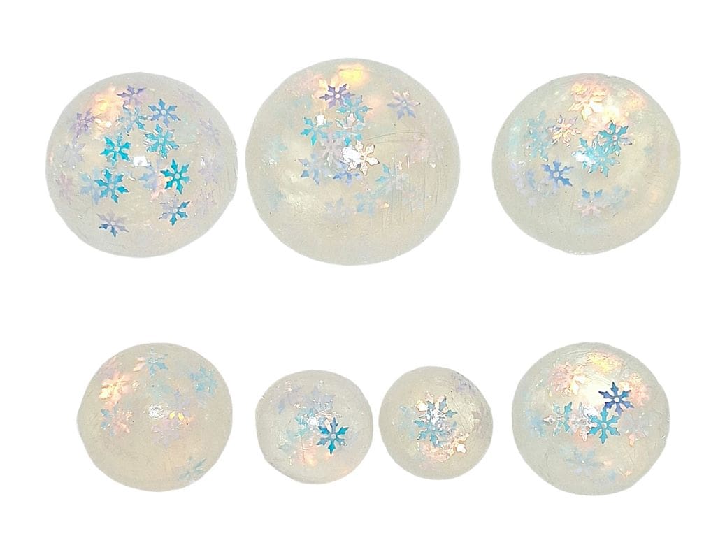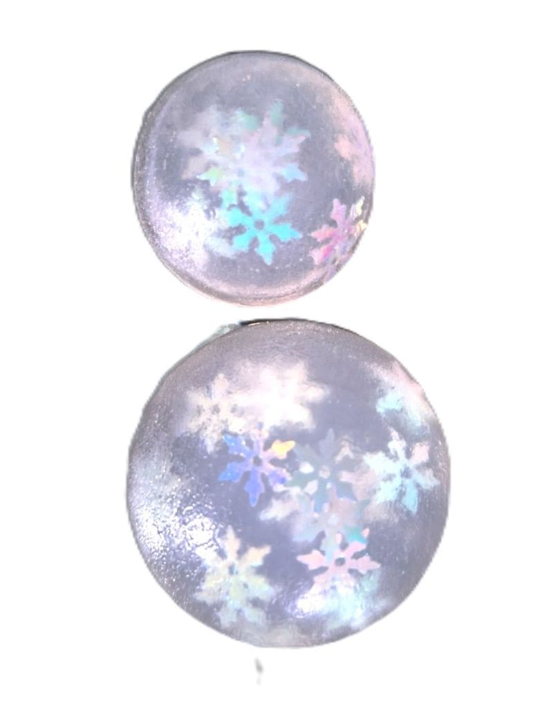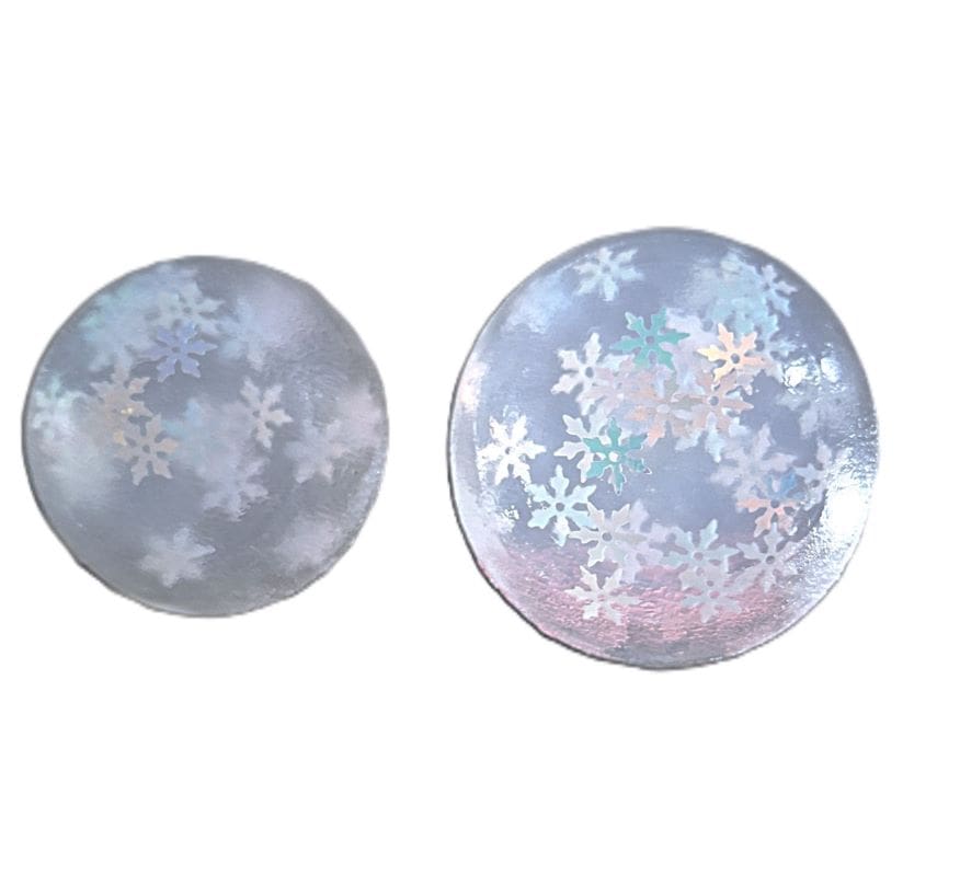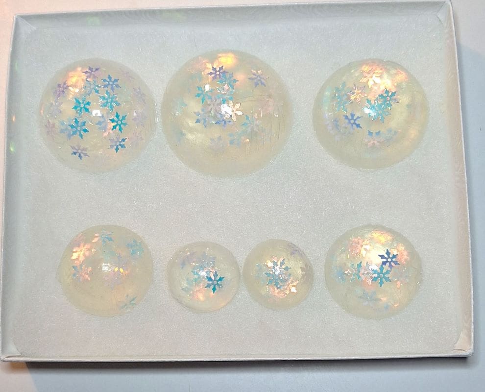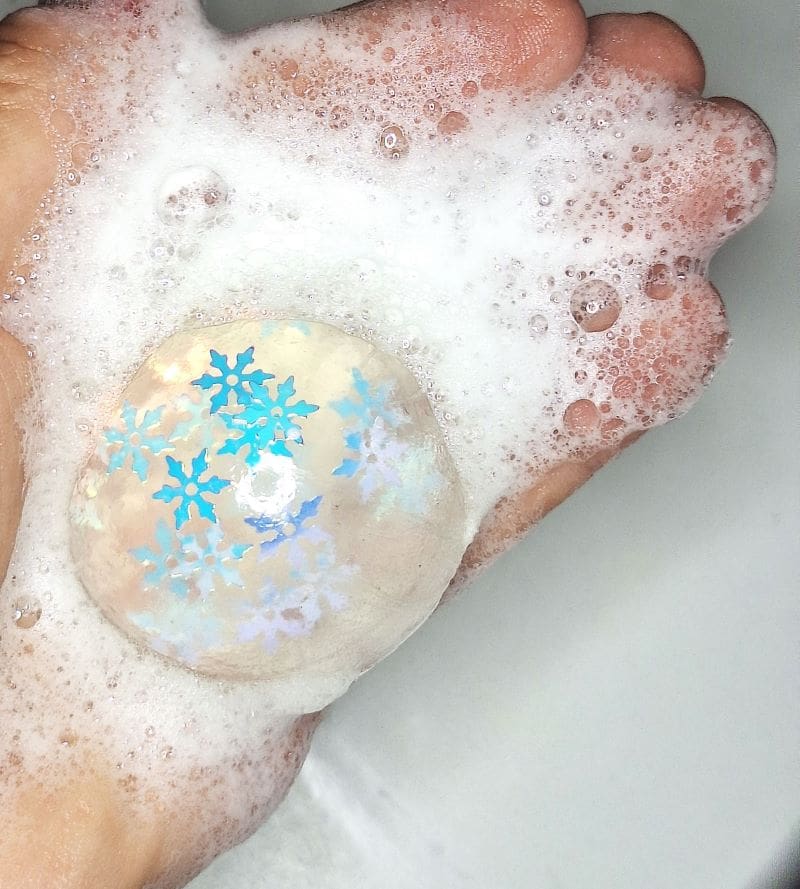 Snowflake Soap Rounds gift set of 6 soaps. Handmade clear unscented vegetable glycerin soaps, meticulously crafted to elevate your skincare ritual. This set of 7 soaps arrives in a gift box all set to present to anyone. Sparkling iridescent snowflakes reflect the lighting and imitate a snow globe. Free from fragrances, gluten-free, and harsh chemicals. These are hypoallergenic. All handmade here in Florida, USA. Our soaps ship within 24 hours to your home or office. There is an assortment of sizes for hand, body and bath. They are sized for hand washing and bathing. Clear vegetable soap base is designed for the most sensitive skin types with allergies, asthma, Celiac Disease and Auto-immune Diseases. No other company makes these beautiful soaps that elevate bathing. They are wonderful for guest, vacation homes, realtors or as a marketing tool. The box set is a wonderful gift for co-workers, room mates, birthdays, teachers and bus drivers. The Soap is made with no animal products, Gluten Free, unscented, hypoallergenic for those who want an alternative to heavy perfumes.