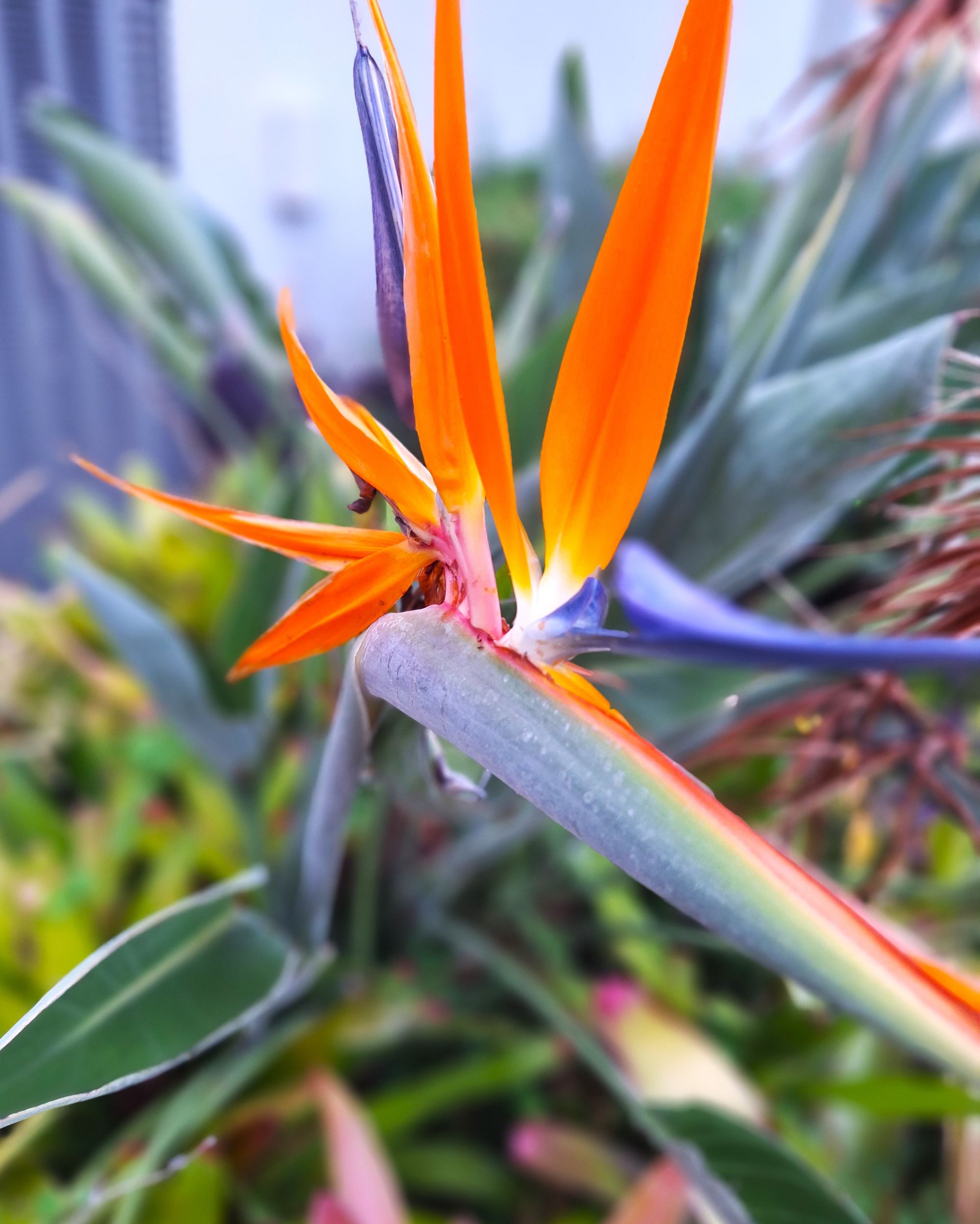 - Vibrant orange tropical flowers with lush gray-green foliage