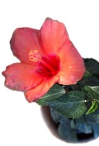 This stunning Salmon Pink Hibiscus features soft coral‑salmon petals with a dramatic red eye center. These are large, blooming 10-inch plants, grown outdoors in South Florida for maximum strength and color.