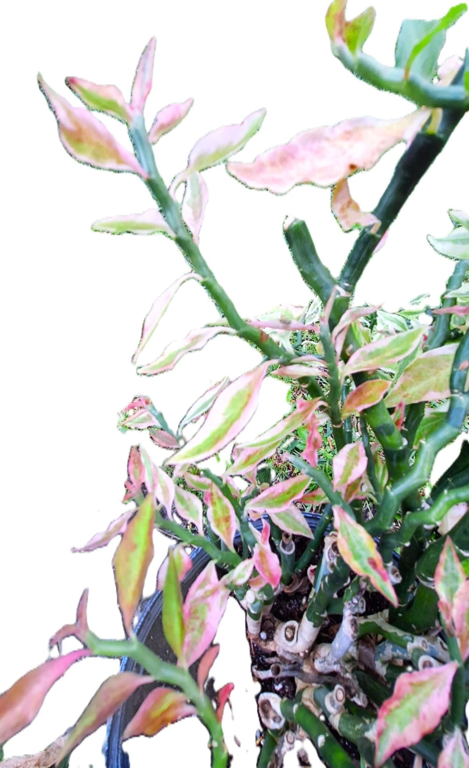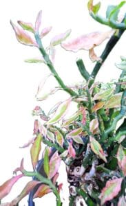 Variegated Devil’s Backbone Zig Zag Plant Pedilanthus tithymaloides Unusual Houseplant. Pedilanthus tithymaloides varagata is also known as Devils Backbone or Zig Zag, False Bird, Red Bird cactus plant is grown here in South Florida. No pesticides applied. You will receive a rooted plant with 4 stems with mature flowering leaves. The pot size is 8″ Gar-Zen Botanical Designs does not ship plastic pots that are harmful to our planet and pollute our waterways, parks and yards. Your plant will arrive in a biodegradable florist wrap. Our plants ship within 24 hours. Easy care wonderful houseplant that will not disappoint you. These plants do well in a hanging basket as well as a ground cover. They will climb up a wall also. They do not need full sun. People also place the pots in trees and on walls and let the plants cascade. They all feature a pink and reddish tip when fully grown and “blooming.” The plant is very odd and catches everyone’s eye. They grow big so get ready, these “Shrubs” can get 7ft across and 3 ft high. For USDA Zones 9-11 they can stay outside all year. Many people use them in landscaping as we do. Gar-Zen Botanical Designs is a Black and minority women owned business located in South Florida.