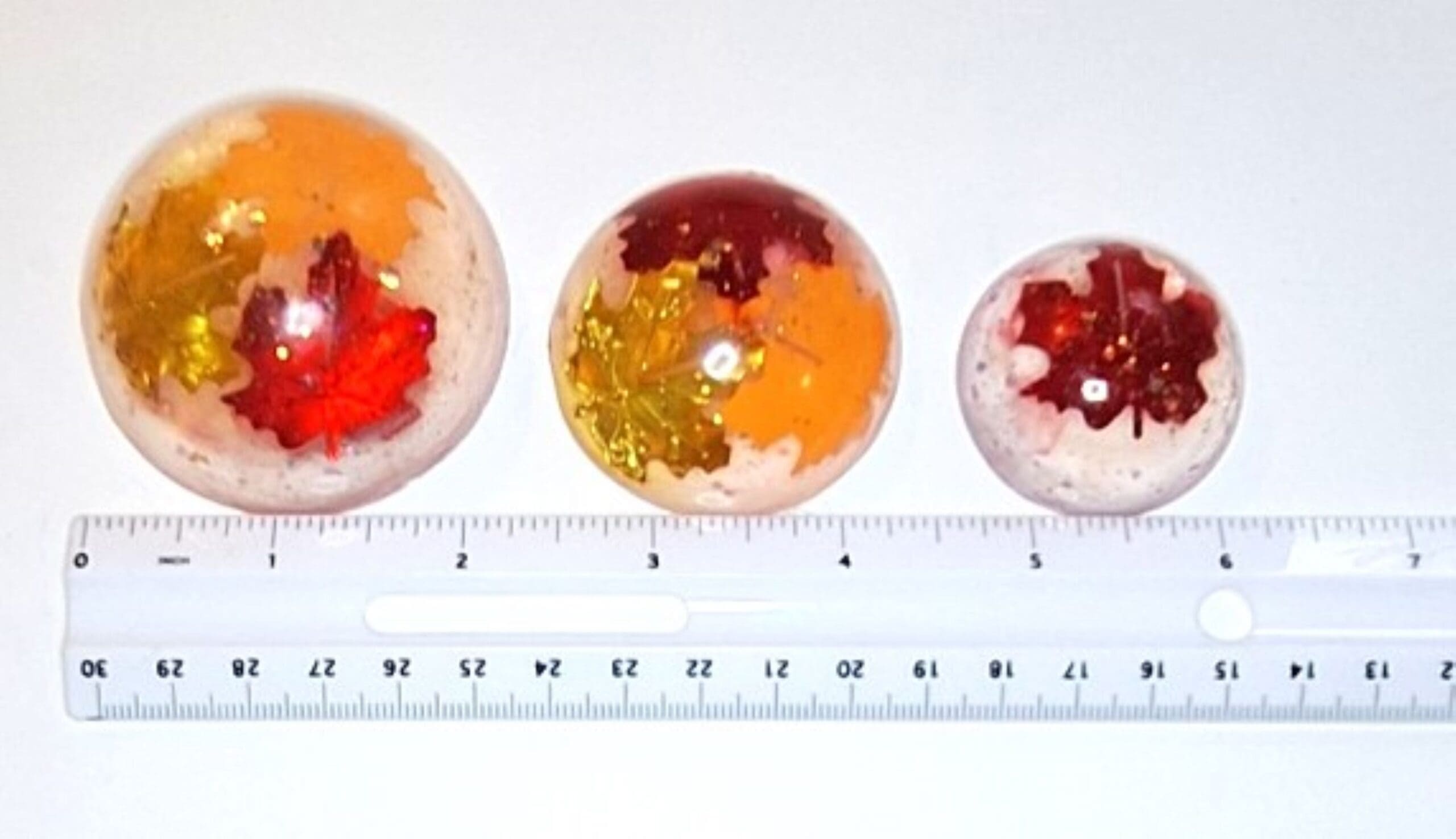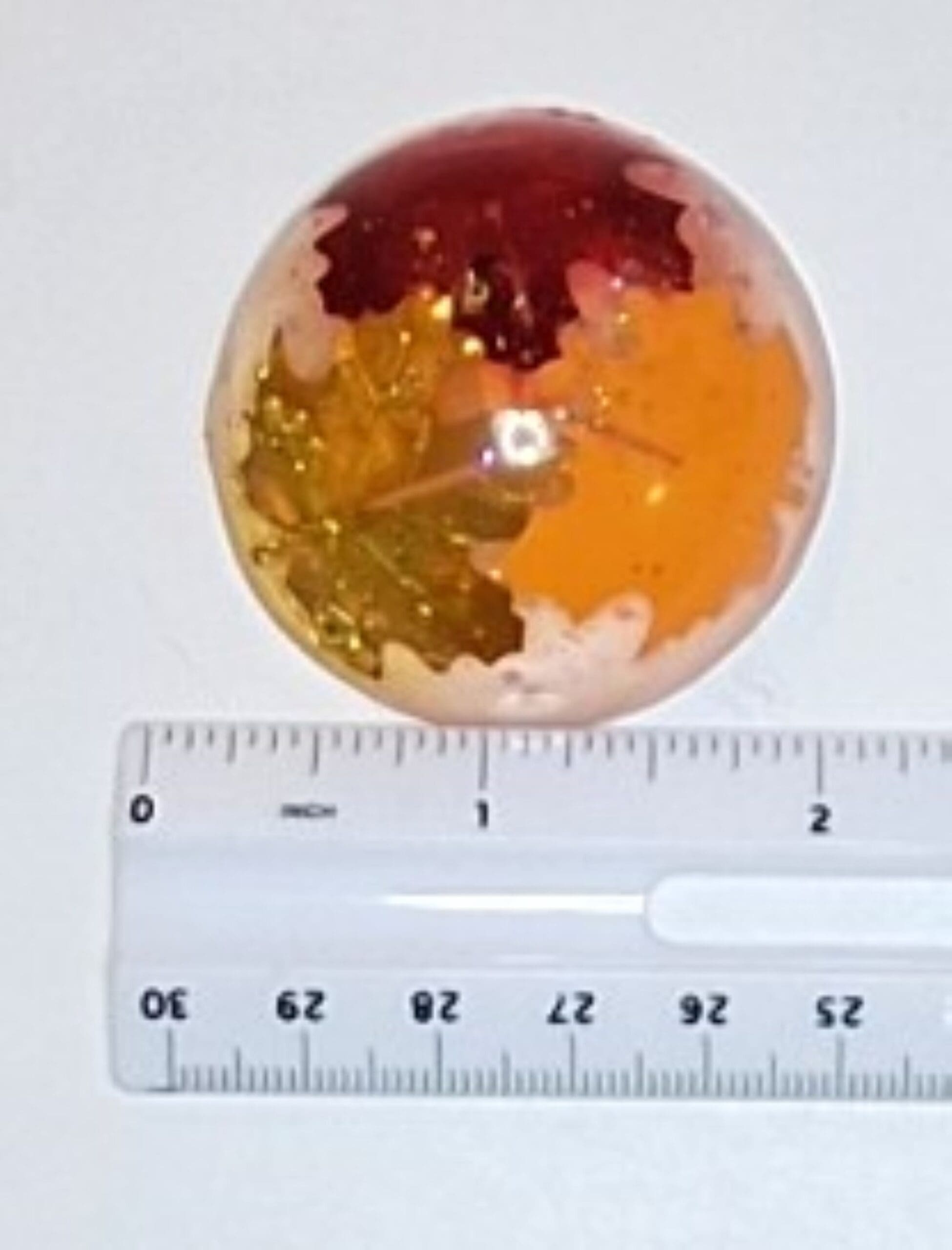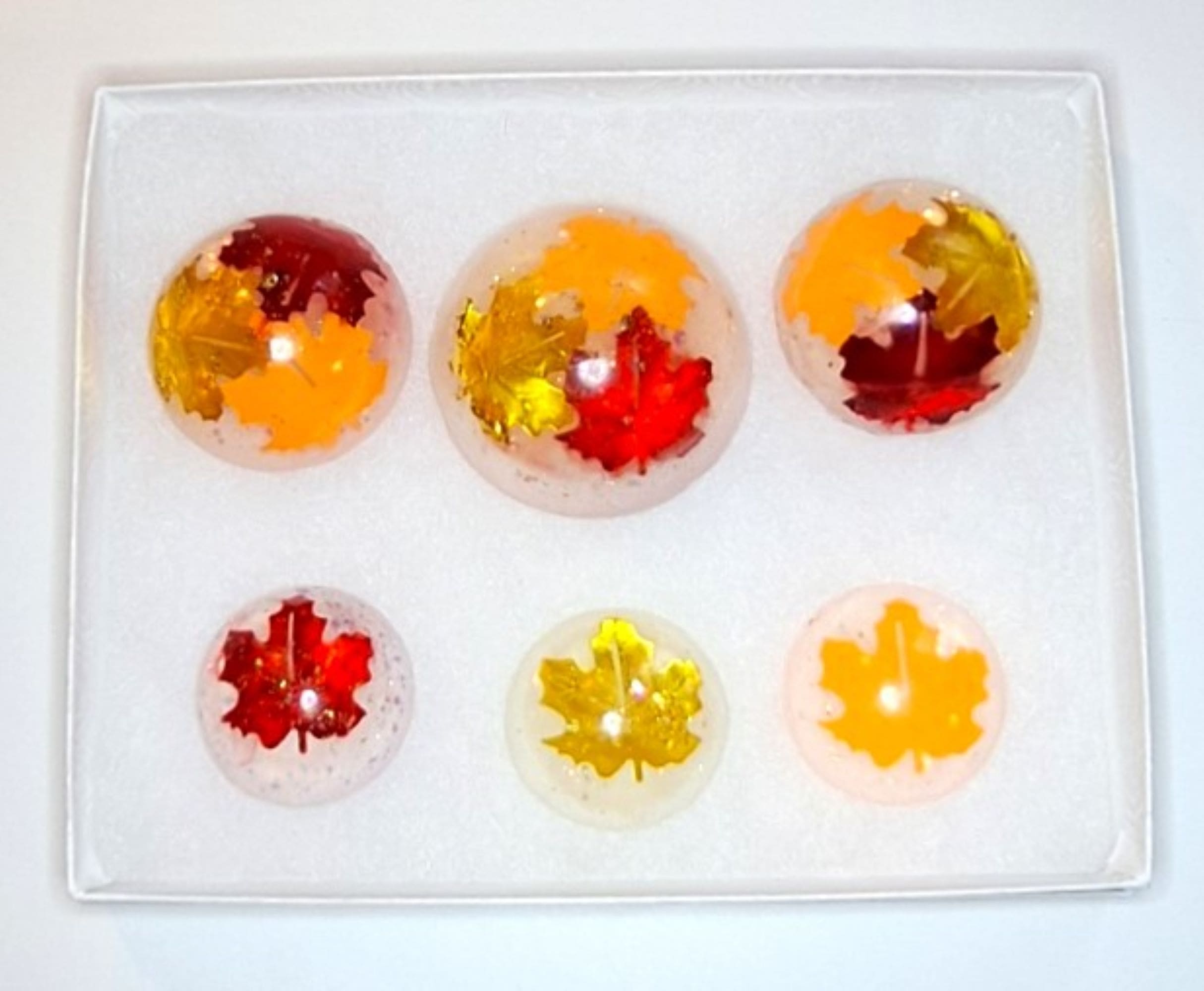 A handcrafted Autumn Leaves Soap Set featuring 6 clear vegan glycerin rounds with floating fall leaves in warm red, orange, and gold tones. Gentle, moisturizing, and perfect for seasonal décor, gifts, or fall‑themed bathrooms.