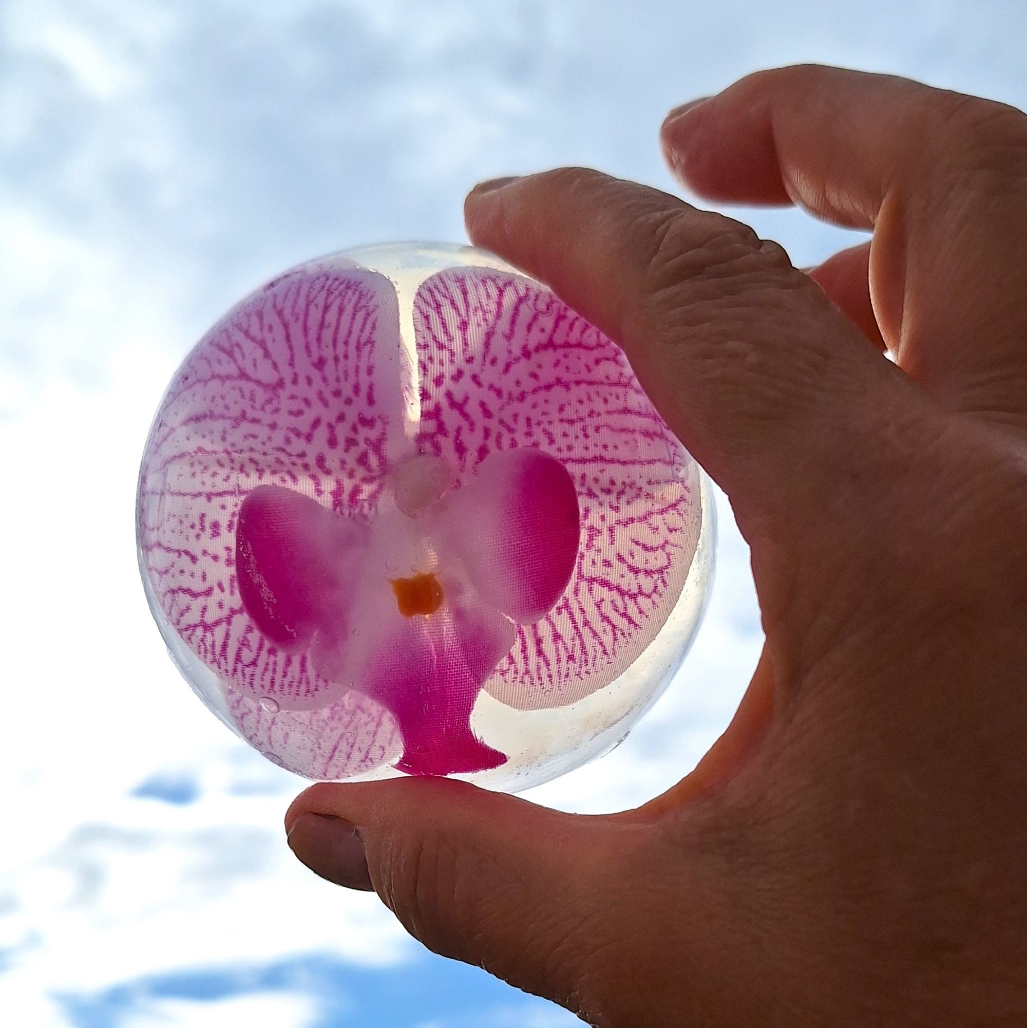 Indulge in a spa‑quality experience with our Vegan Orchid Soap — a large 6‑inch diameter botanical glycerin round featuring a preserved orchid suspended inside. Each soap is handcrafted, hypoallergenic, and made with clear vegan vegetable glycerin, offering a gentle, moisturizing cleanse for adults, children and pets. Cruelty-free, Gluten-free, unscented perfume free. No harsh chemicals, all made in the USA. These soaps make stunning gifts, elevate guest bathrooms, and bring botanical beauty to everyday routines. Single soaps arrive in a gift pouch. All soaps are individually wrapped and labeled for your safety. If you purchase a 2-soap set, the soaps arrive in a gift box.