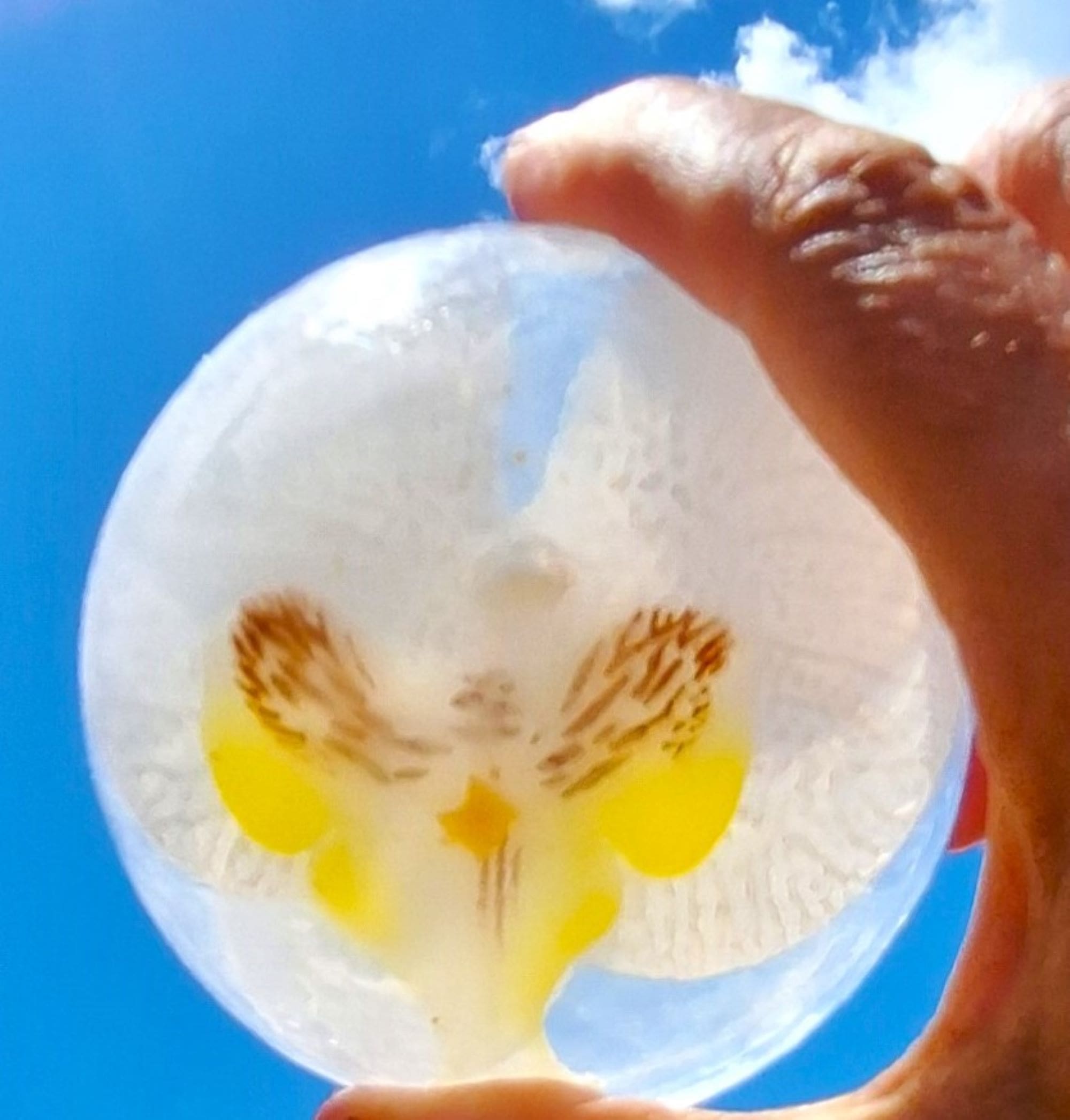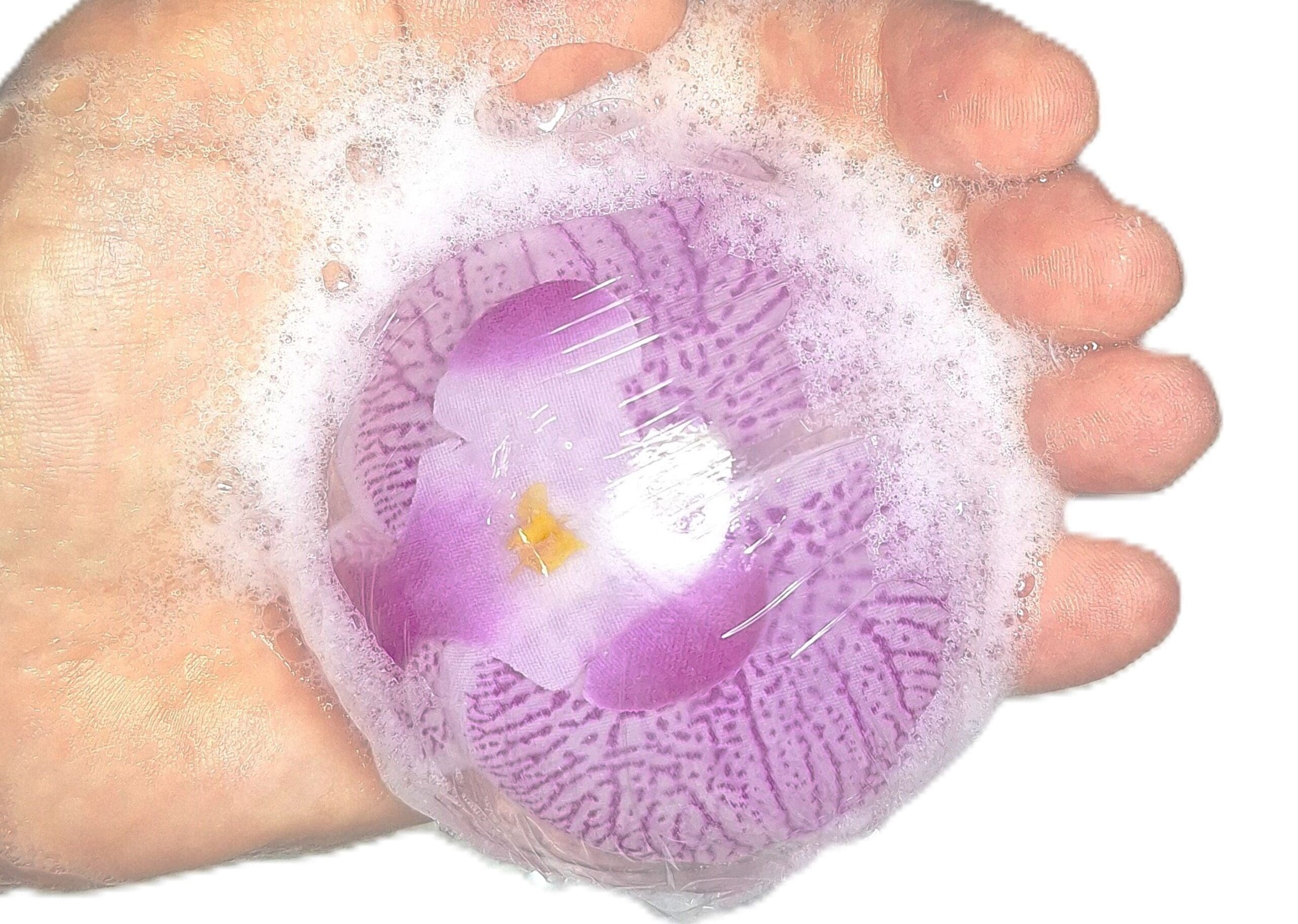 A luxurious vegan 6‑inch botanical glycerin soap featuring a preserved orchid inside. Available in Purple or Yellow. Designed for adults who enjoy elegant, natural bath décor. Sold individually or as a discounted 2‑pack.
