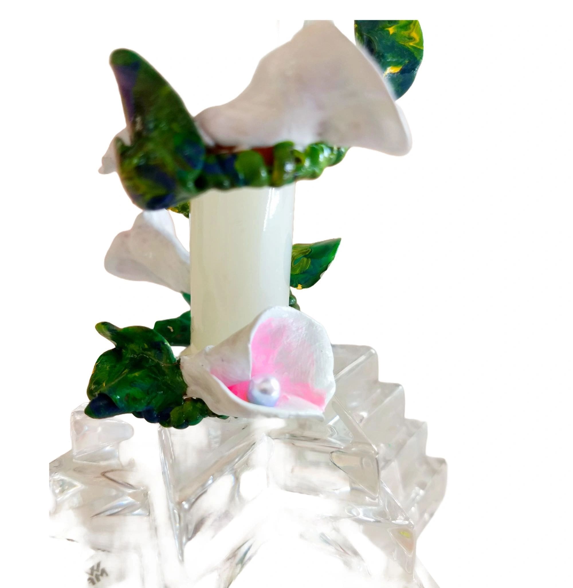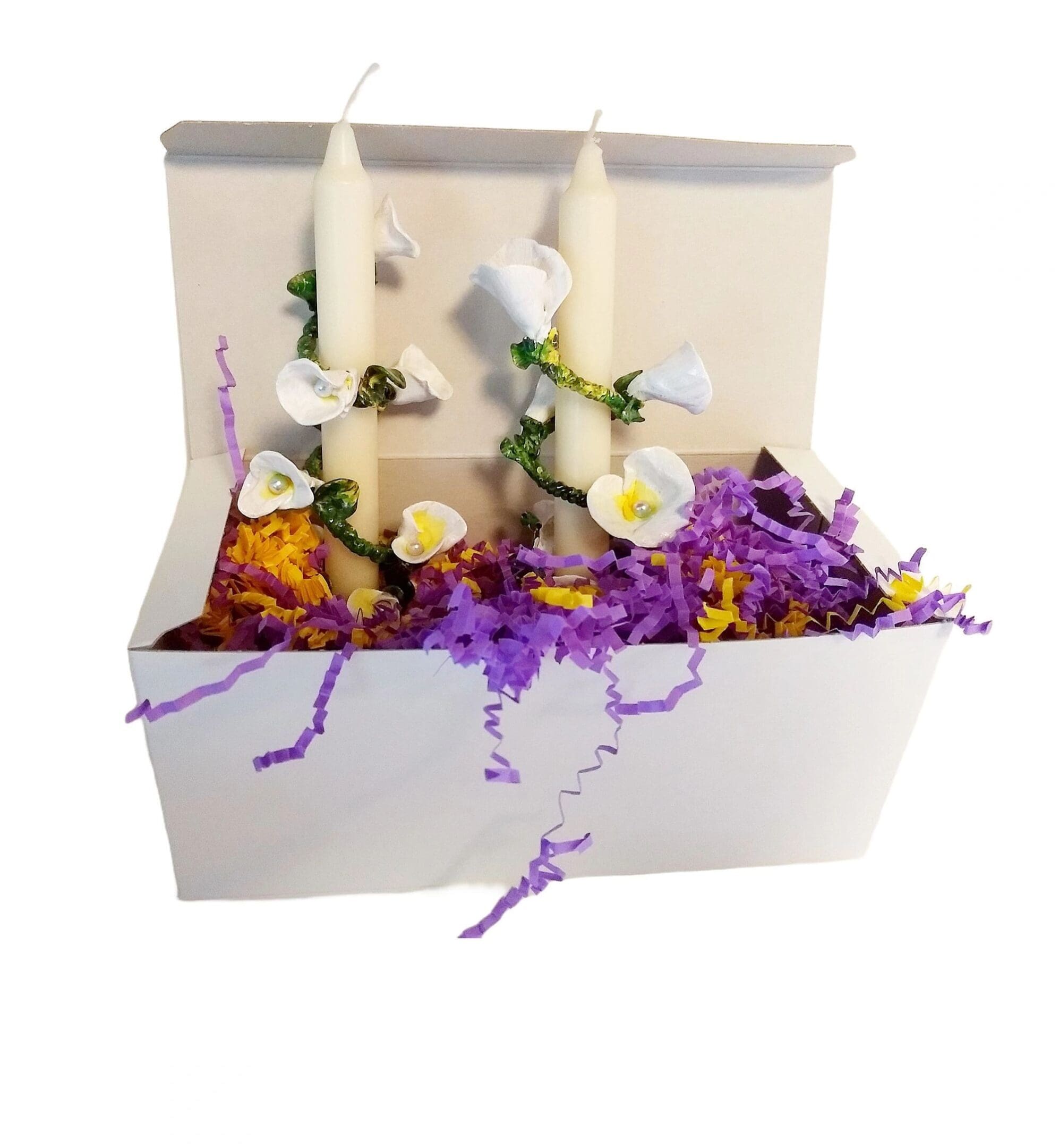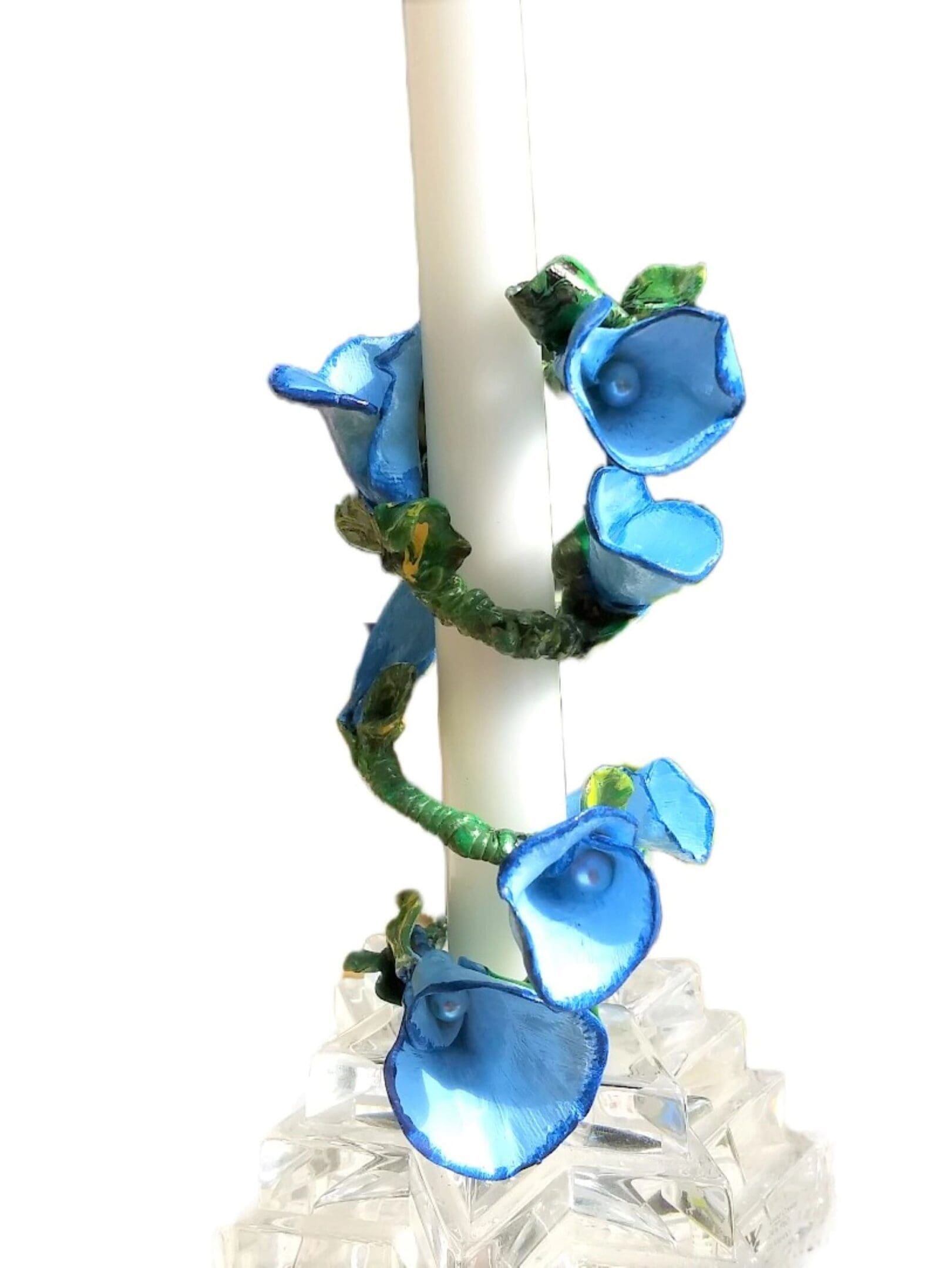 White 6″ Taper Dinning Candles with Blue Cala Lily Wraps. These ceramic candle wraps (set pair)with 6″ taper candles are a beautiful and unique way to dress up your dinner table or add a touch of elegance to any room in your home. You will need candle holders (base) which is NOT included. Made in the USA. They are also REUSABLE, so you can enjoy them for years to come. Totally unique as each is handmade and gift boxed perfectly so presenting them will be easy. The candles are 6″ Paraffin candles. These ceramic wraps of Cala Lilies YOUR CHOICE OF: BLUE, Yellow or Pink are REUSABLE and slip onto any dinner taper candle so they can be used for years to come. A great gift that can be used year round indoors or outdoors. We also design these for weddings and special occasions as anniversaries, showers and events. Instead of bringing wine or liqueur that is used once, this is a great option.