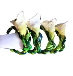 White Cala lily napkin rings make a wonder gift for teachers, bus drivers, neighbors or yourself. They are made from non-toxic polymer ceramic which is waterproof, stain proof and rinse clean. Do not place in a dishwasher or microwave.